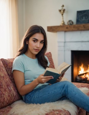 提供一张人物照,并提示“一个女孩坐在沙发上,看书,壁炉”(类型选“人物照”),则生成的图片将引用提供图片中的脸。